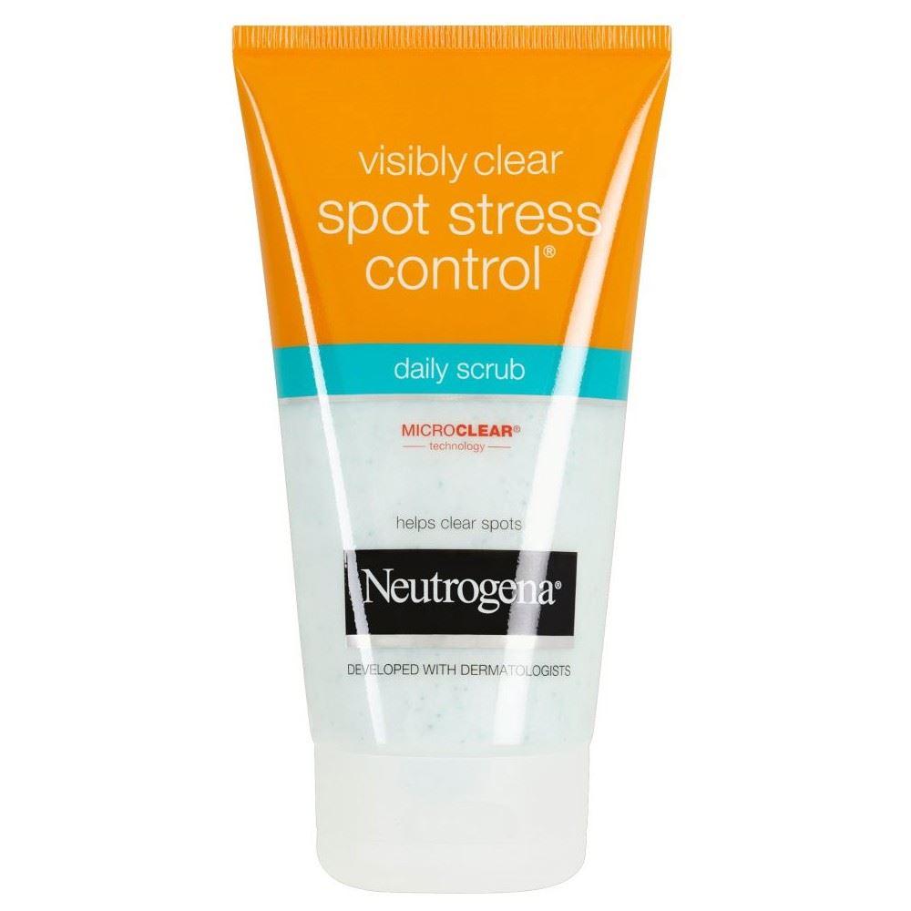 Neutrogena visibly clear spot stress control daily scrub. A powerful creamy scrub to help clear spots and make spots one less stress. Its formula with micro beads gently exfoliates dead skin cells while removing oil and dirt. With unique Micro clear technology, the formula unclogs pores to penetrate deep down and help clear spots. Enriched with green tea and cucumber, it soothes skin and is gentle enough for everyday use without over-drying. Skin is clearer and healthy-looking… so you have one less stress to deal with.