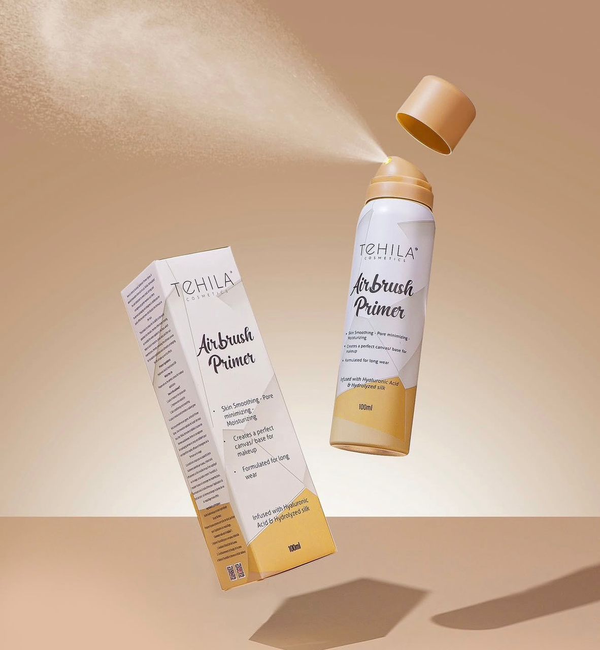 Tehila Airbrush Primer Spray is a lightweight, refreshing mist that primes the skin for flawless makeup application. It preps the face by hydrating, smoothing, and locking in moisture, creating a perfect base that helps makeup last longer. Its spray form makes it quick, easy, and convenient for both personal and professional use.